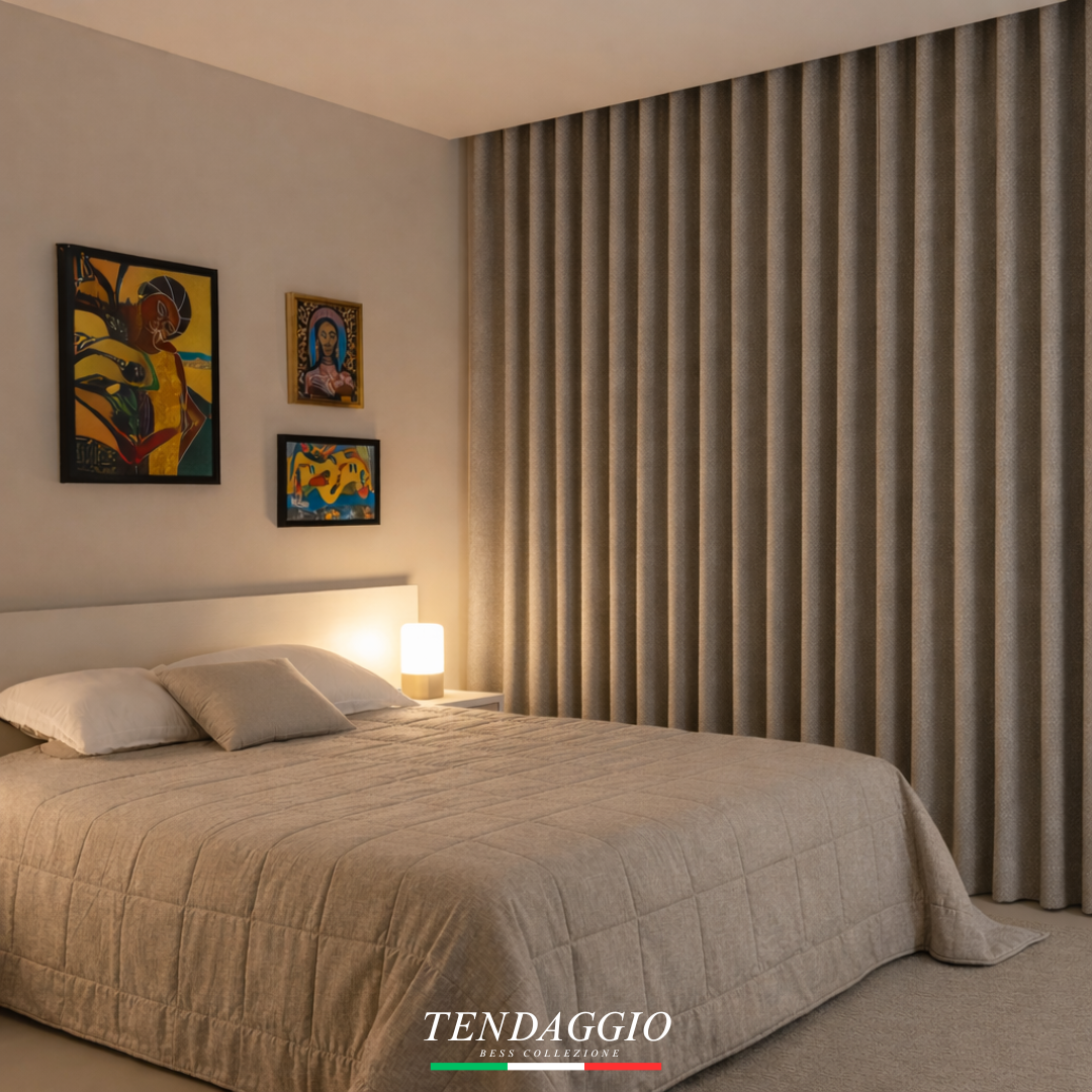 Tendaggio e sua versatilidade Com estrutura encorpada e acabamento refinado, Tendaggio expressa sua versatilidade em aplicações que transitam com elegância entre cortinas e colchas.